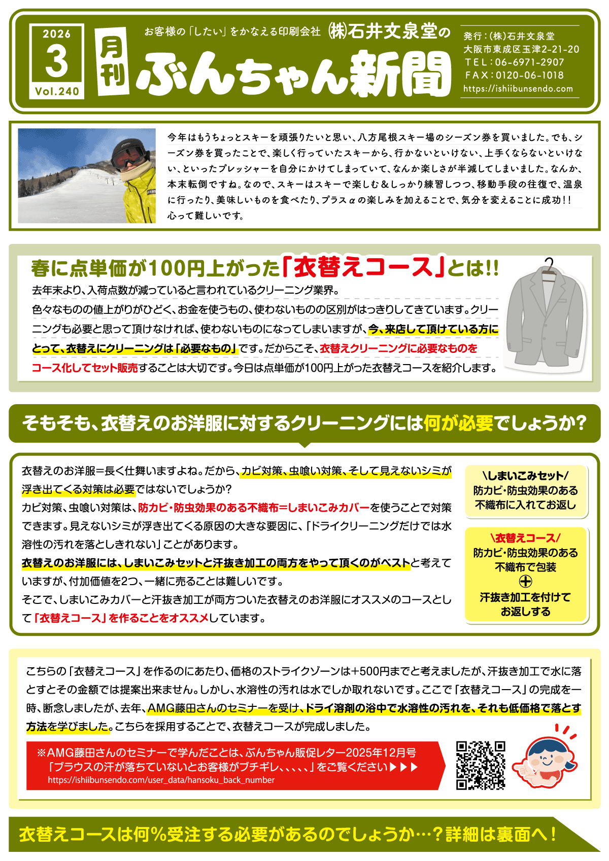 ぶんちゃん新聞では、238号までは当社の活動やスタッフ情報などをお届けしておりましたが、239号からは下記のぶんちゃん販促レターと合体し、クリーニング店さまへの販促をメインにお伝えしてきます。バックナンバーも見られますので、ゆっくりとお楽しみ下さい。