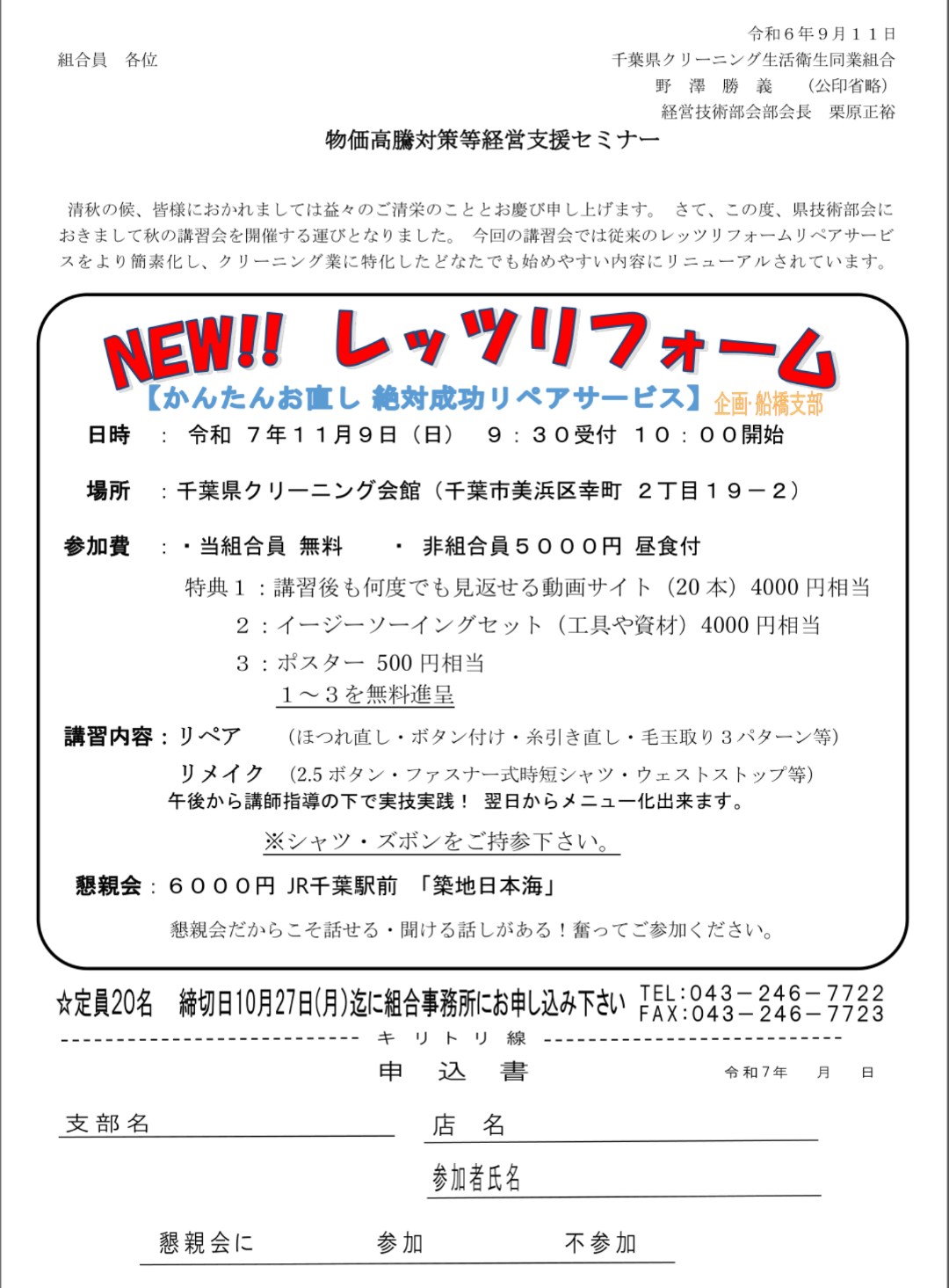 千葉県クリーニング組合が主催で、「レッツリフォーム お直し、リペアセミナー」が開催されますが、今回は非組合員さんも参加OKとのこと。