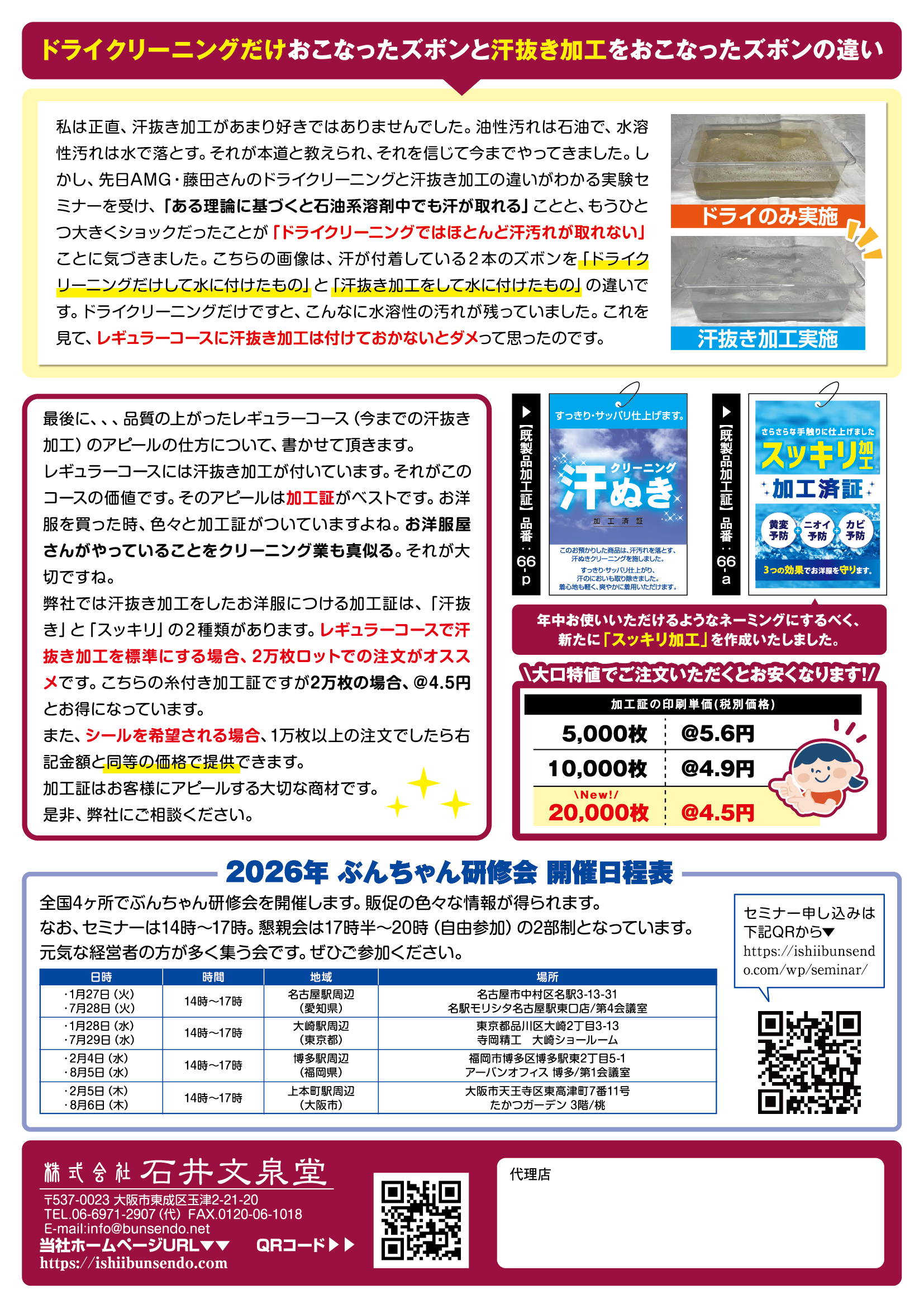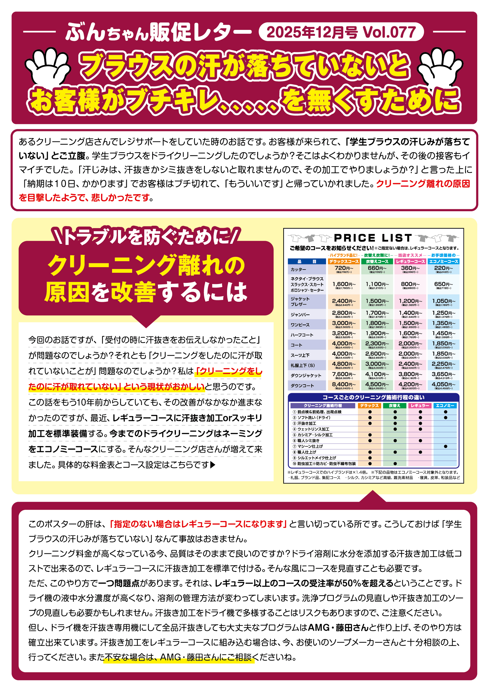 ブラウスの汗が落ちていないとお客様がブチキレ、、、、、を無くすために 2025/11/14 2025/11/14 お手紙のネタ, 付加価値販売, 売上UPのネタ まいどです。クリーニング専門の印刷会社の石井(社長)です。 あるクリーニング店様で遭遇した事例です。 こういうことがきっとあちこちで起こっています。 そして、それがクリーニング離れに繋がります。 それを防ぎたいので、ある考え方を書かせて頂きました。 本日も最後まで読んで頂き、ありがとうございます。 石井文泉堂 石井康裕 Tweet