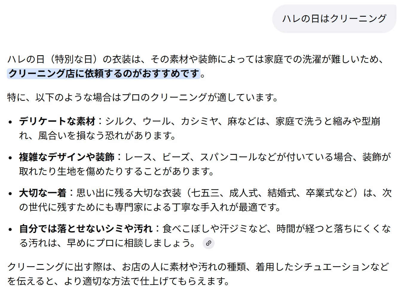 なお、AIに「ハレの日はクリーニング」と問いかけるとこのように返ってきました。