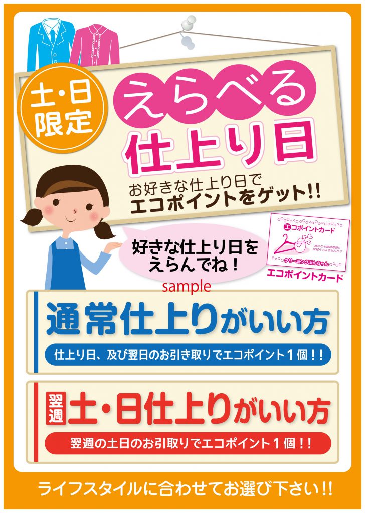 お客様に取りに来られる仕上がり日を選んで頂くって、お客様にとってもクリーニング店さんにとってもいいですよ。こんなポスターを貼ってみませんか?